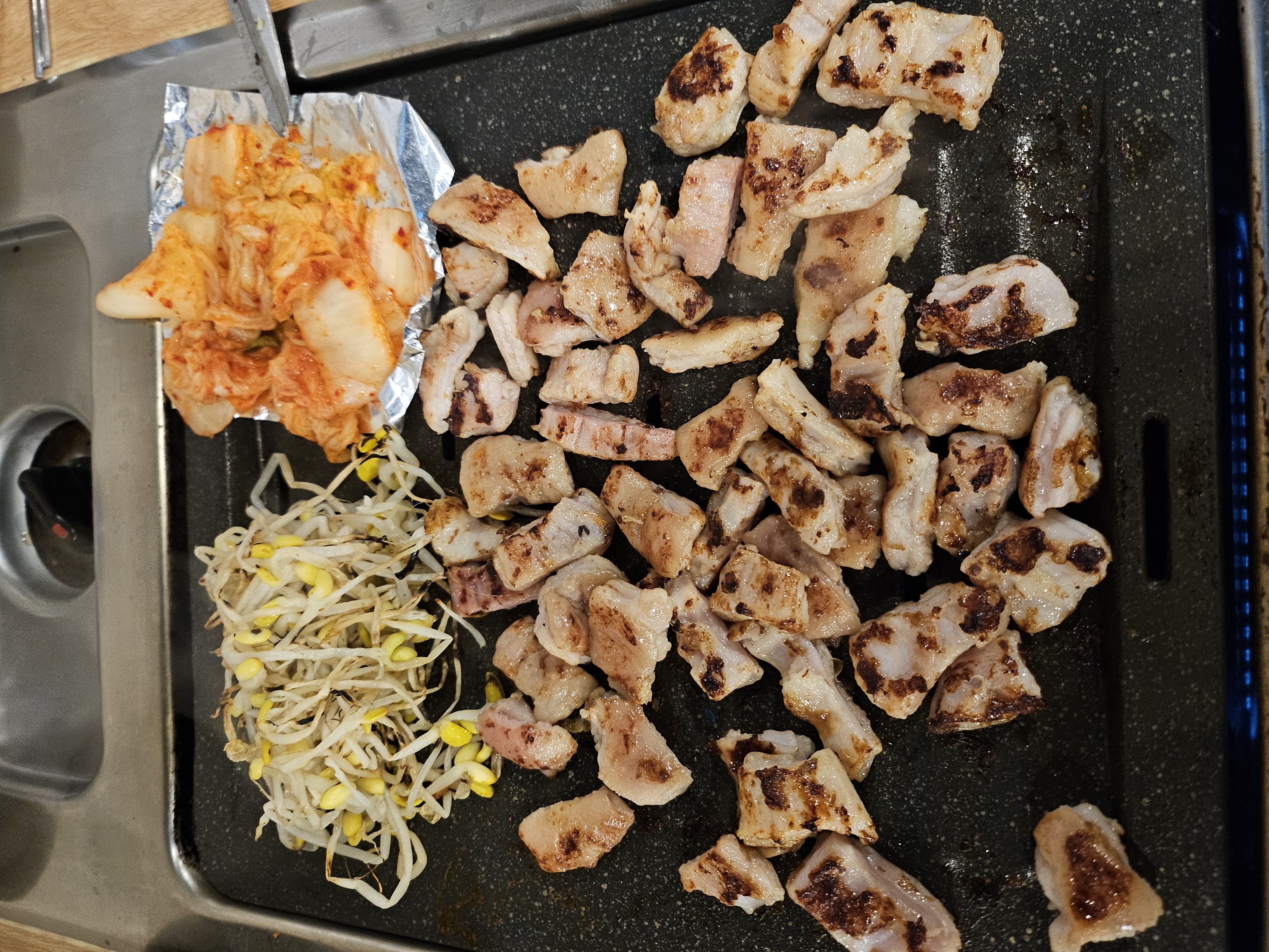 게다가 김치와 콩나물을 구워서 함께 먹는 조합이 정말 별미예요.